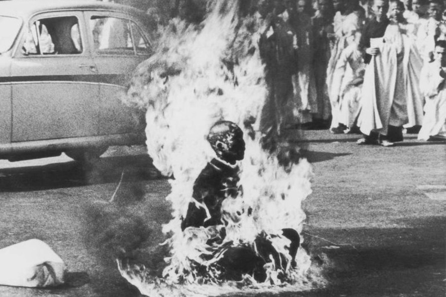 Vào sáng ngày 11/6/1963, tại ngã tư đường Lê Văn Duyệt và Phan Đình Phùng (nay là Cách Mạng Tháng Tám và Nguyễn Đình Chiểu, TP.HCM), Hòa thượng Thích Quảng Đức đã thực hiện hành động tự thiêu. Ngài ngồi trong tư thế thiền định, tĩnh lặng giữa ngọn lửa, thể hiện sự an lạc và kiên định hiếm có.