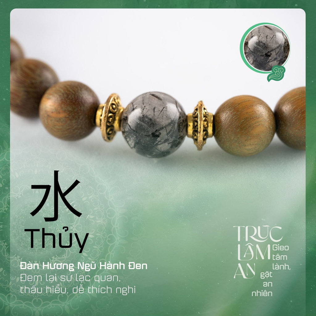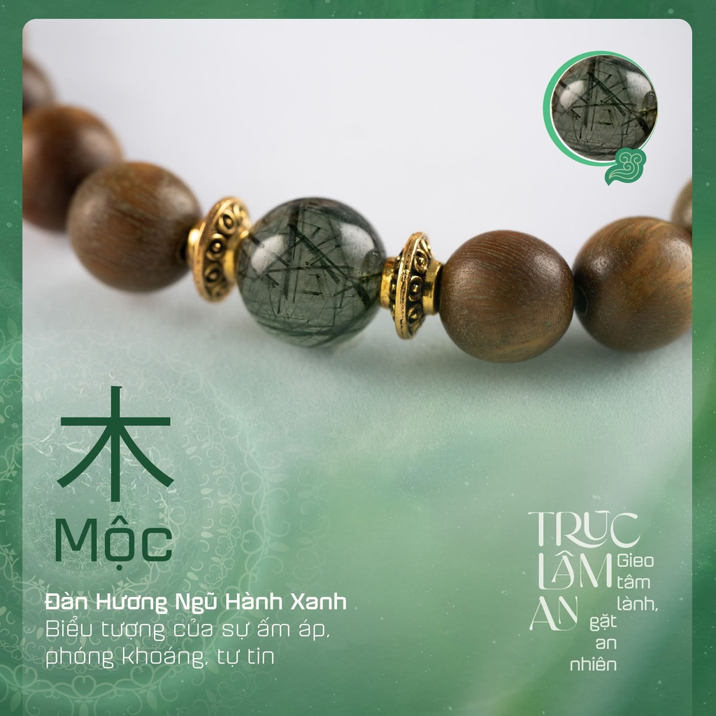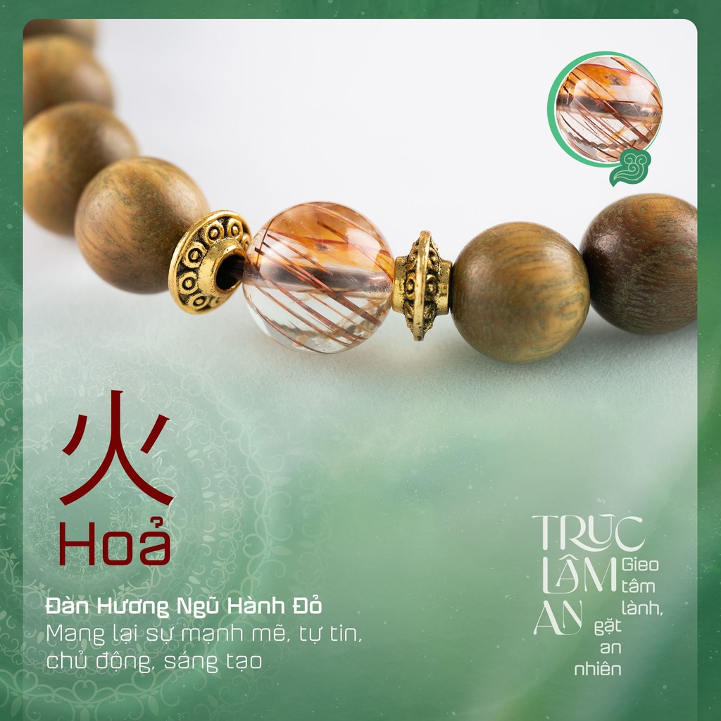 - Thiết kế: Những hạt gỗ đàn hương bóng mịn được đan lại bằng dây cao cấp mix cùng charm đá Thạch anh tóc chia theo 5 màu ngũ hành đại diện cho sự giao hòa của Tâm - Mệnh - Đạo, mang lại sự bình an, may mắn và định hướng sống tỉnh thức.